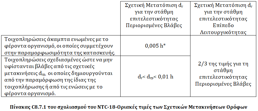 Αυτός ο στόχος επιτυγχάνεται όταν οι τιμές των σχετικών μετακινήσεων ορόφων είναι κάτω από τα όρια που υποδεικνύονται στον ακόλουθο πίνακα: