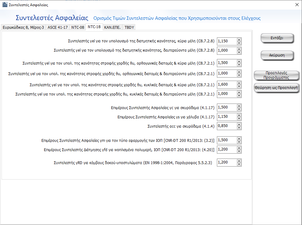 Οι τιμές των συντελεστών ασφαλείας και οι εκφράσεις του Κανονισμού που χρησιμοποιούνται, μπορούν να καθοριστούν μέσω του πλαισίου διαλόγου που ανοίγει από το αντίστοιχο κουμπί. Σημειώνεται ότι οι προεπιλεγμένες τιμές των συντελεστών ασφαλείας είναι αυτές που ορίζονται από τον NTC-18.