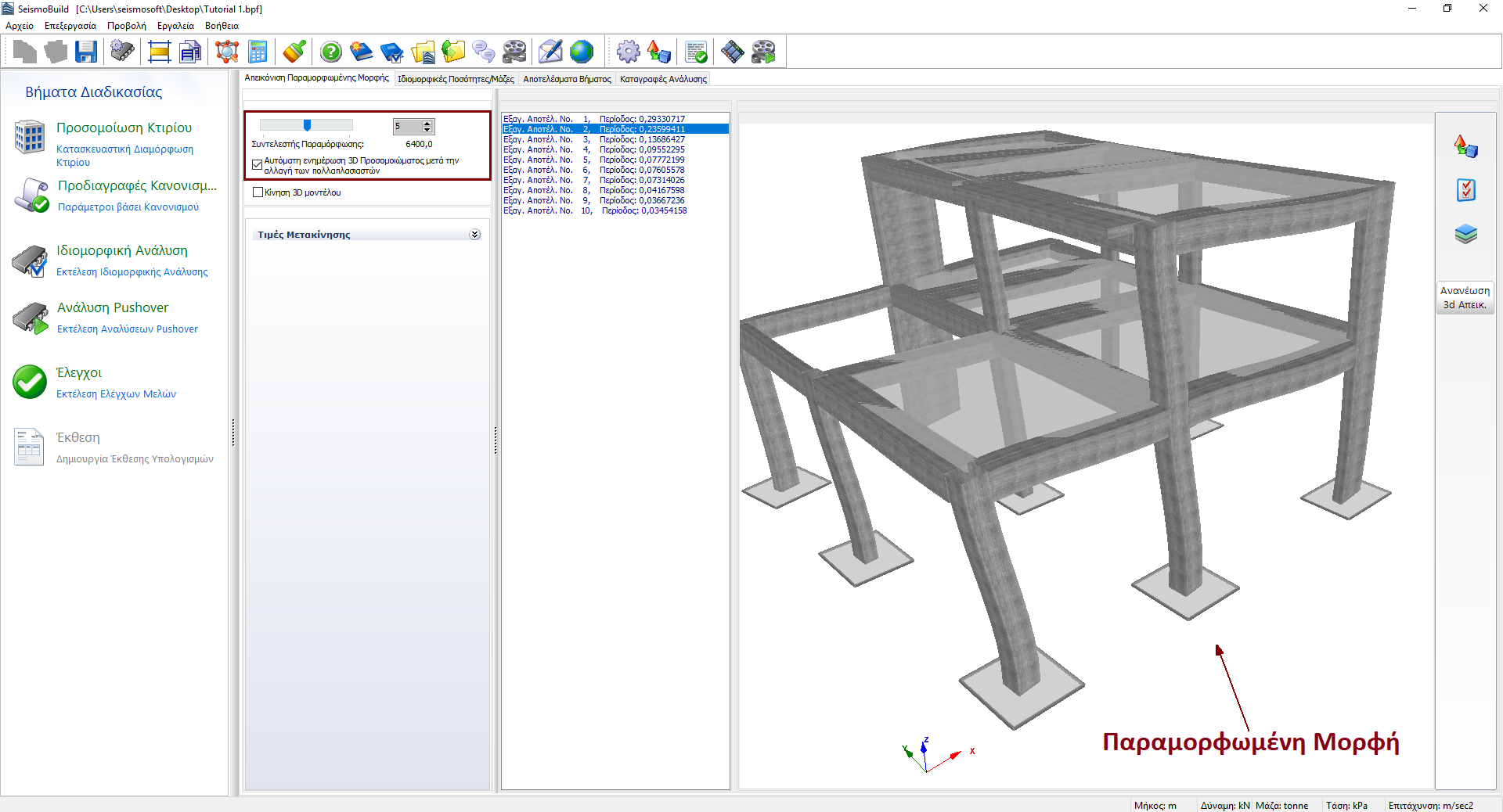 Τέλος, η ιδιομορφή ταλάντωσης της κατασκευής (όπως προκύπτει από την ιδιομορφική ανάλυση) μπορεί να απεικονιστεί γραφικά μέσω της επιλογής του πλαισίου Κίνηση 3D Μοντέλου.