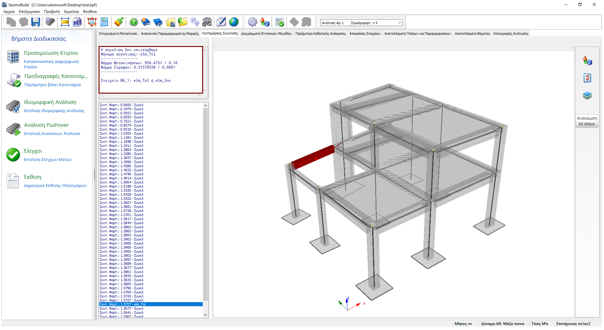 Όποτε προκύπτουν προβλήματα σύγκλισης, οι χρήστες μπορούν να ενημερωθούν για τα στοιχεία που προκαλούν τις αποκλίνουσες λύσεις. Τα στοιχεία ή οι θέσεις της κατασκευής όπου προκαλούνται τα προβλήματα σύγκλισης, σημειώνονται στη 3D προβολή, ενώ πληροφορίες σχετικά με τον τύπο της απόκλισης (νόρμες της σύγκλισης και τα όριά τους, μήνυμα απόκλισης και τα αντίστοιχα στοιχεία ή κόμβοι) απεικονίζονται στην πάνω-αριστερή γωνία της οθόνης.