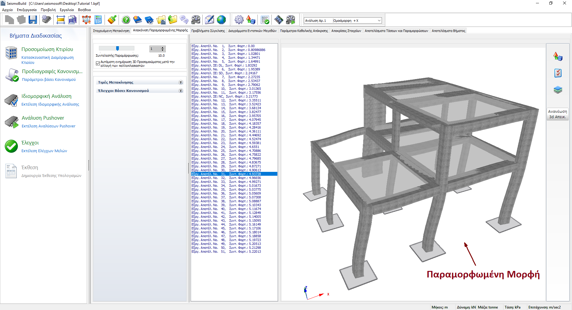Με την Απεικόνιση Παραμορφωμένης Μορφής, οι χρήστες έχουν τη δυνατότητα να δουν το παραμορφωμένο σχήμα του μοντέλου σε κάθε βήμα της ανάλυσης (κάντε κλικ στο επιθυμητό βήμα εξόδου για να ενημερώσετε την προβολή του παραμορφωμένου σχήματος), διευκολύνοντας έτσι την παρατήρηση των παραμορφώσεων και τελικά των μηχανισμών κατάρρευσης.