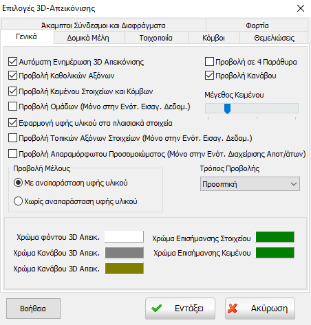 Οι επιλογές των ρυθμίσεων της 3D απεικόνισης του μοντέλου της κατασκευής μπορούν να προσαρμοστούν ώστε να πληρούν τις προτιμήσεις και απαιτήσεις του χρήστη.