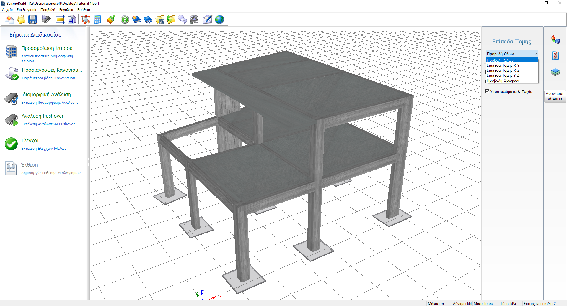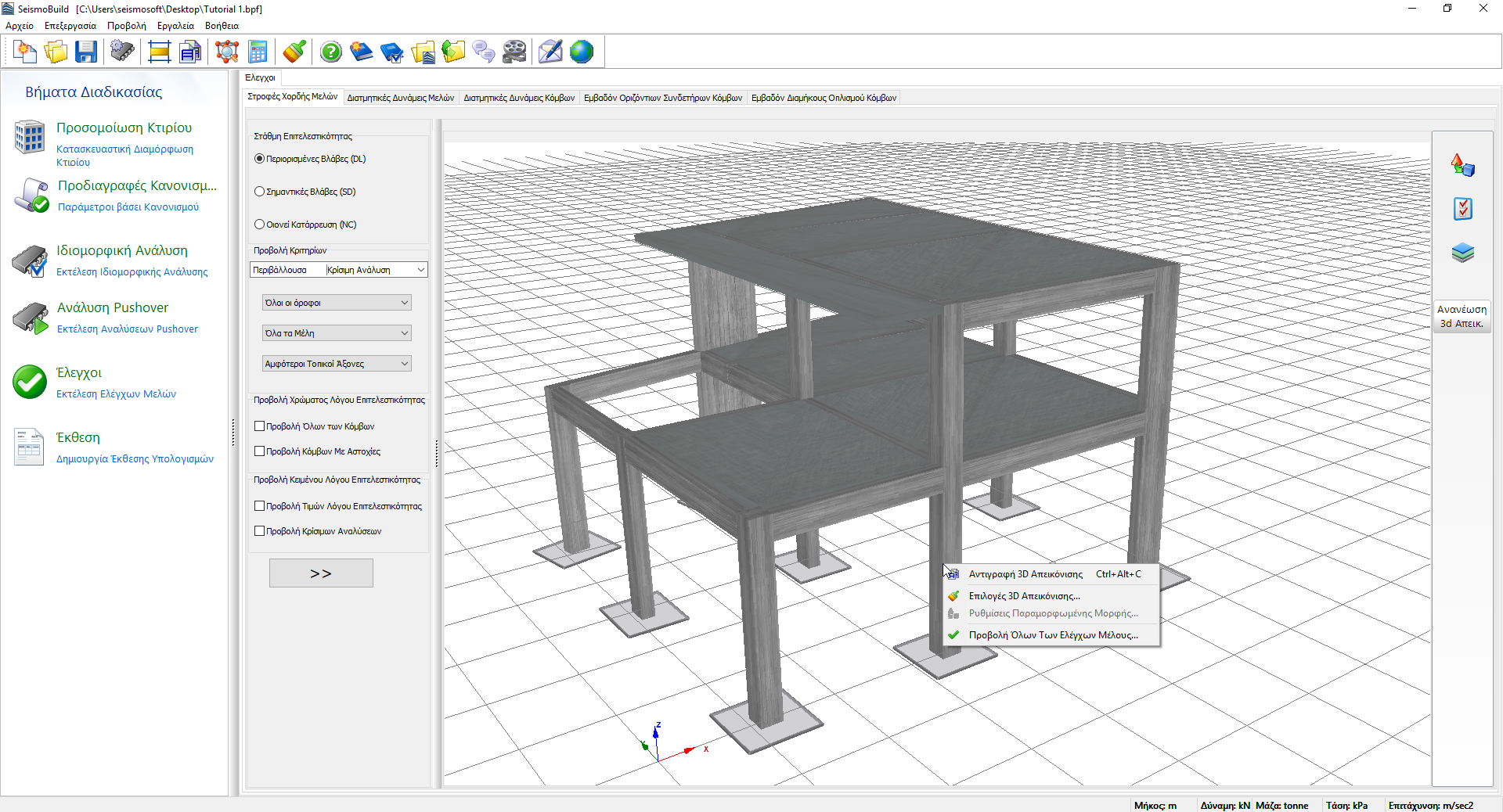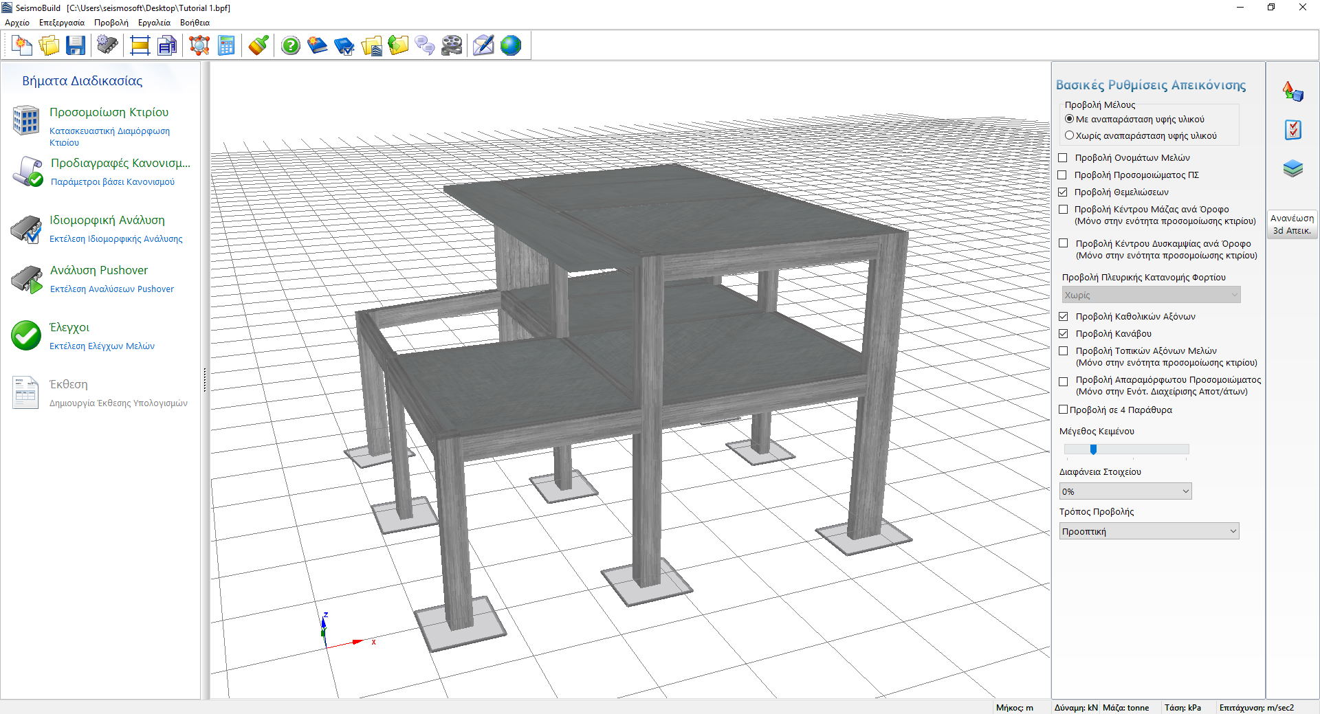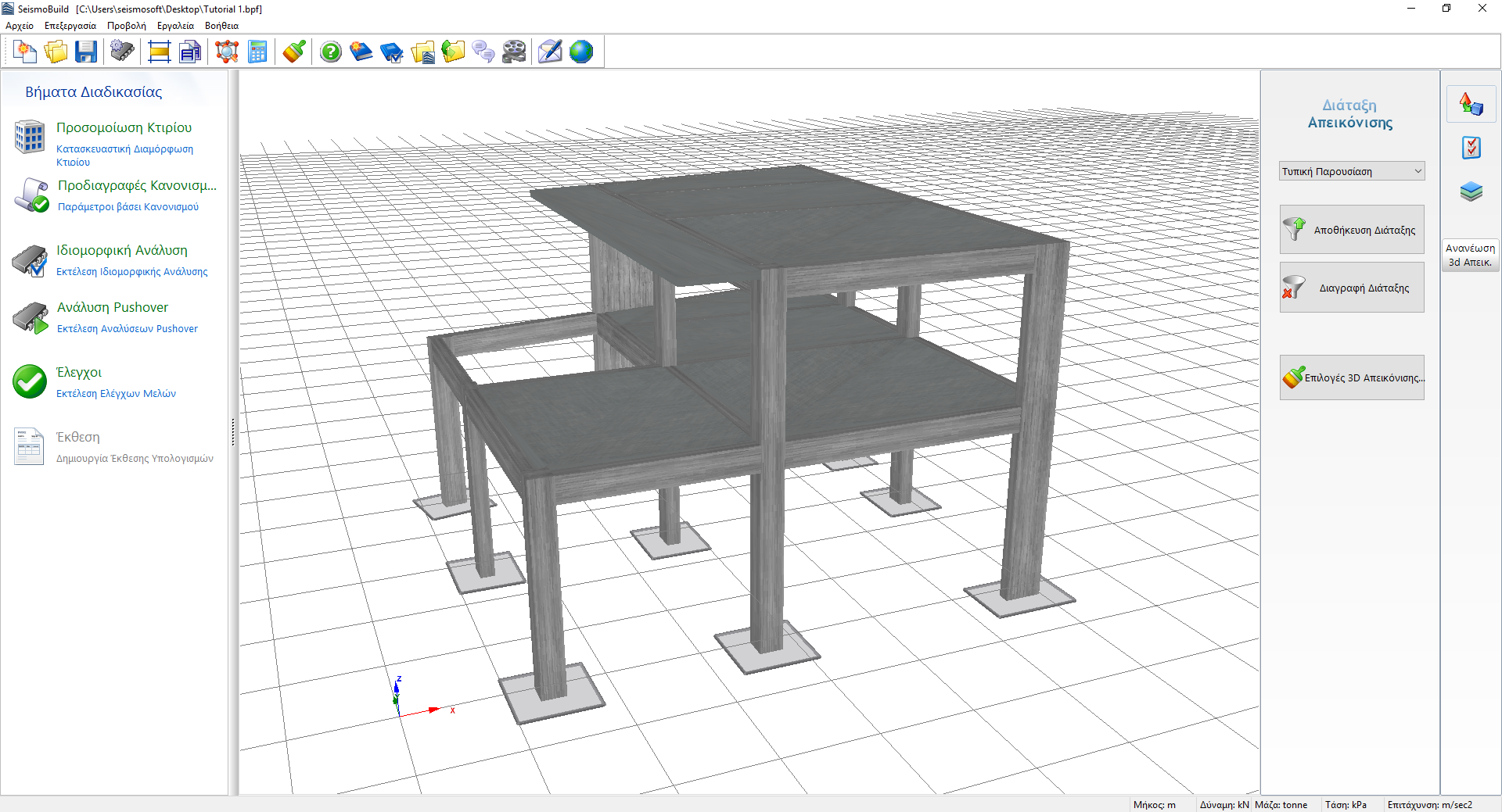 στα δεξιά, οι χρήστες μπορούν (i) να επιλέξουν τις ρυθμίσεις προβολής του προσομοιώματος, όπως η Τυπική Παρουσίαση (προεπιλογή) και το Structural_Model (το τελευταίο είναι ιδιαίτερα χρήσιμο όταν απεικονίζονται οι εσωτερικές δυνάμεις), (ii) να αποθηκεύσουν τις προσωπικές τους ρυθμίσεις προβολής ή (iii) να τροποποιήσουν τις Επιλογές της 3D Απεικόνισης.
