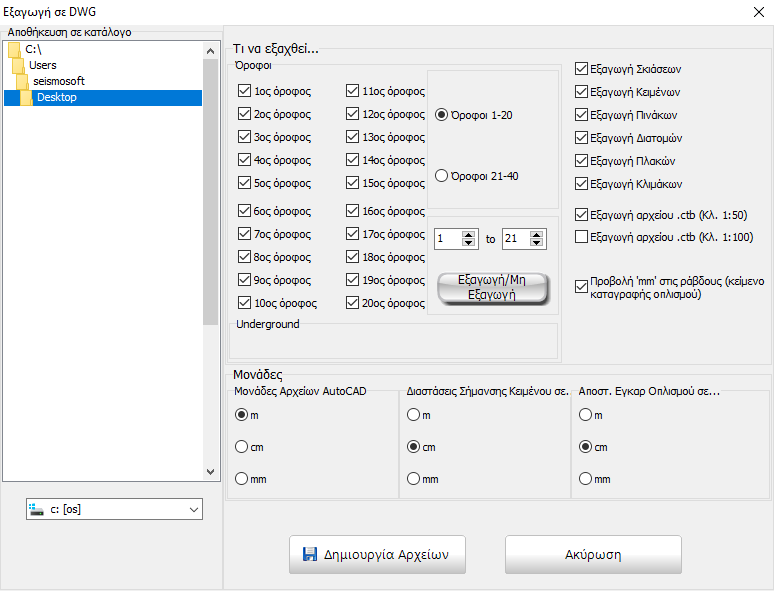 Οι χρήστες μπορούν να ορίσουν τον αριθμό των εξαγόμενων αρχείων (ένα αρχείο ανά όροφο) και τις πληροφορίες που θα περιλαμβάνονται στο αρχείο CAD, οι μονάδες κλπ.