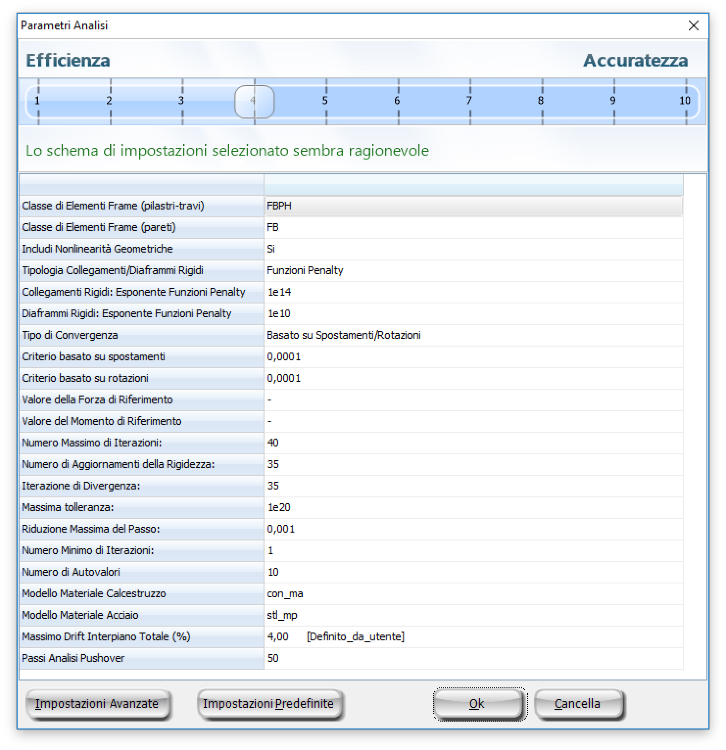 All’interno di questo modulo gli utenti sono in grado di definire tutti i parametri richiesti per i calcoli analitici nonlineari, selezionando uno schema di impostazioni predefinite, premendo sul pulsante Impostazioni Avanzate o facendo doppio click su uno specifico valore per aprire la corrispondente scheda nel modulo Impostazioni Avanzate.