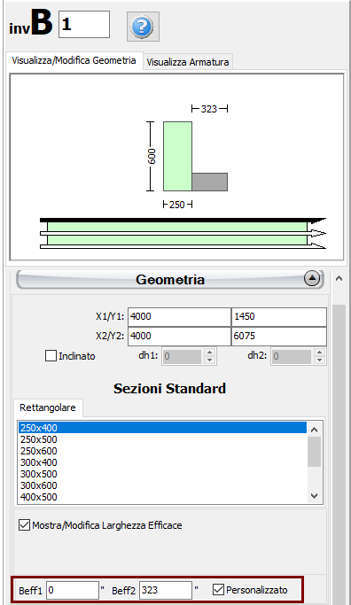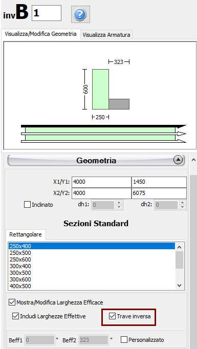 Dopo aver assegnato le travi ed i solai del modello strutturale, gli utenti possono definire le travi inverse. Per fare ciò, selezionare la trave per poter accedere alla Finestra delle Proprietà, selezionare quindi l'opzione Mostra/Modifica Larghezza Efficace e Includi Larghezza Effettiva. Queste opzioni devono essere abilitate, in modo tale da poter attivare l'opzione Trave inversa.
