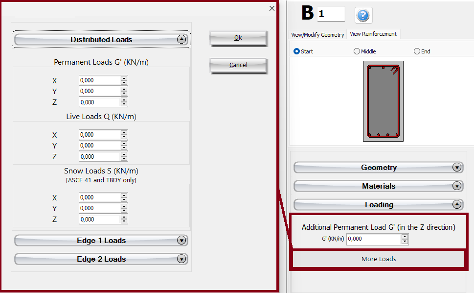 Nel modulo delle sezioni delle travi, è possibile anche assegnare dei carichi permanenti distribuiti aggiuntivi, che serviranno a definire qualsiasi carico non associato al peso proprio della struttura (come le finiture, le tamponature, i carichi variabili, ecc.). Inoltre, i carichi possono essere definiti anche cliccando sul pulsante Altri Carichi. Gli utenti possono definire forze distribuite uniformemente lungo la lunghezza del membro in tutte e tre le direzioni traslazionali (X, Y o Z), e forze o momenti in qualsiasi direzione traslazionale o rotazionale (X, Y, Z, RX, RY o RZ) su uno dei due bordi del membro (inizio o fine). Possono essere applicati carichi permanenti aggiuntivi G’ (non associati al peso proprio della struttura), carichi variabili Q e carichi di neve S, quest'ultimi applicabili solo a ASCE 41 e TBDY. Per impostazione predefinita, tutti i carichi sono uguali a zero.