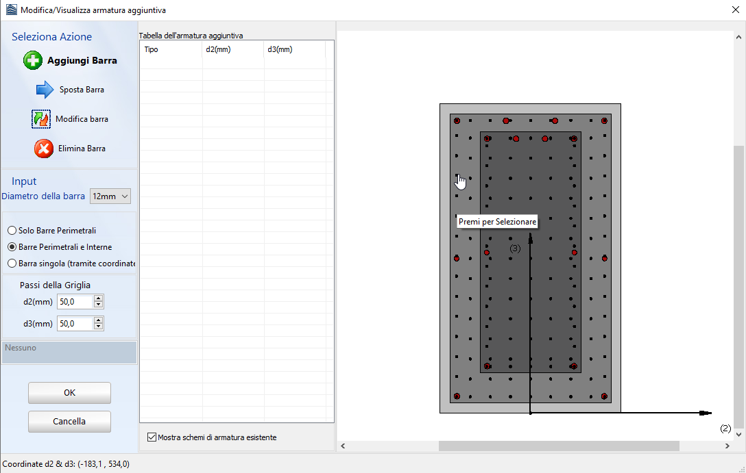 L'aggiunta di singole barre longitudinali di armatura al rivestimento può essere effettuata anche tramite il corrispondente modulo Armature Aggiuntive, dove è possibile introdurre graficamente un'ulteriore armatura sia nella parte esistente che in quella nuova della sezione, come mostrato nella figura seguente: