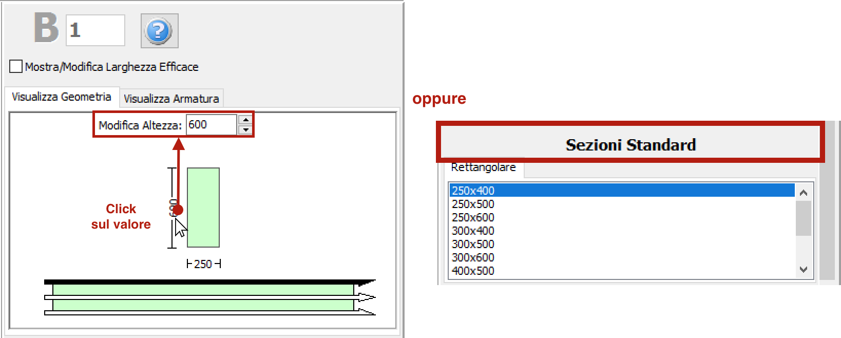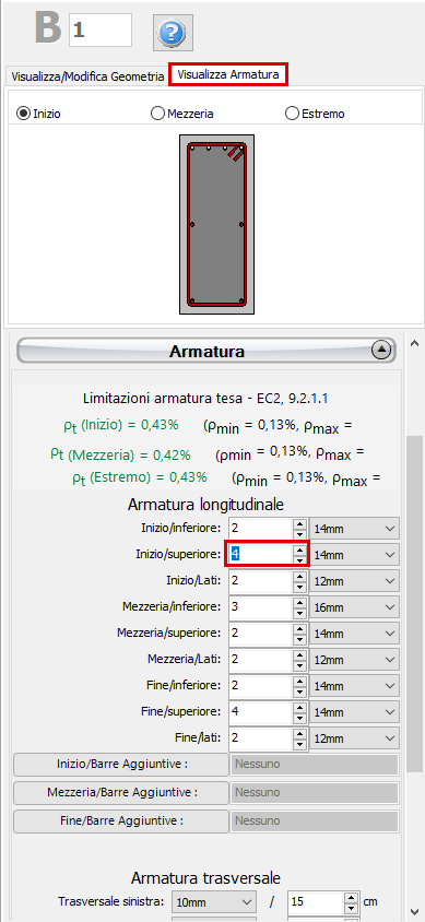Nella Finestra delle Proprietà gli utenti possono scegliere tra l’opzione Visualizza Armatura, in cui viene mostrata l’armatura (longitudinale e trasversale) nelle sezioni iniziale, di mezzeria e finale, e l’opzione Visualizza/Modifica Geometria, in cui possono essere visualizzate e modificate le dimensioni della sezione.