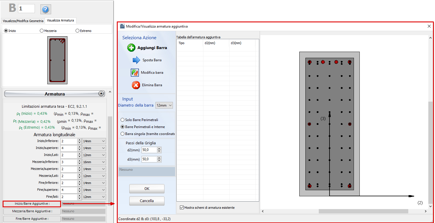 Inoltre, è possibile definire le armature longitudinali e trasversali modificando gli schemi d’armatura rilevanti. È possibile definire anche schemi d’armatura differenti, a seconda che si tratti della sezione di mezzeria o di quelle alle due estremità della trave. È inoltre possibile inserire singole barre d’armatura tramite il corrispondente pulsante Barre Aggiuntive; nella finestra successiva Modifica/Visualizza armatura aggiuntiva è possibile introdurre le barre graficamente, come mostrato nella seguente figura: