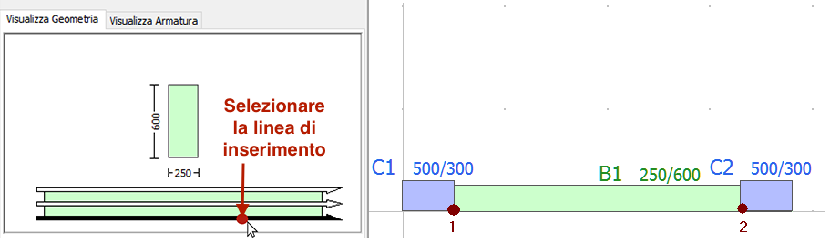 Quando una trave assegnata interseca un pilastro o una parete esistente, questa viene suddivisa automaticamente ed il programma genera due elementi distinti. Di conseguenza, può risultare utile definire diverse travi allineate con solo due click del mouse.