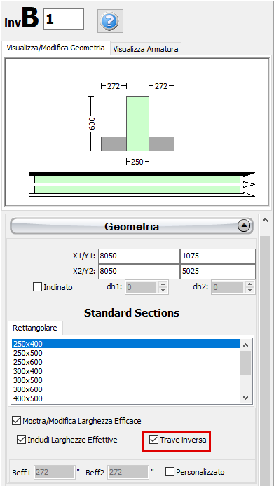 Una volta definiti i solai, nell'area Geometria della Finestra delle Proprietà delle travi appariranno due opzioni aggiuntive: (i) selezionare se includere o meno la larghezza effettiva della trave e (ii) selezionare se la trave è inversa o meno. La larghezza effettiva viene calcolata automaticamente dal programma, anche se può essere modificata dall’utente.