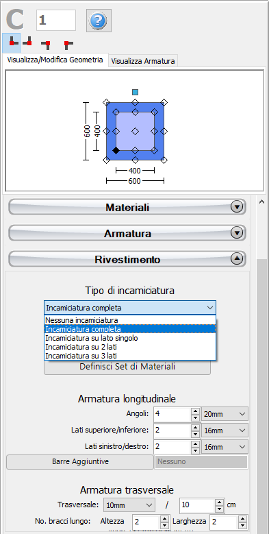 Le camicie possono essere applicate alla sezione nell'area Incamiciatura selezionando il tipo di rivestimento, cioè se incamiciatura completa, su 1 lato, su 2 lati o su 3 lati, e assegnando il set di materiali e il rinforzo longitudinale e trasversale della camicia.