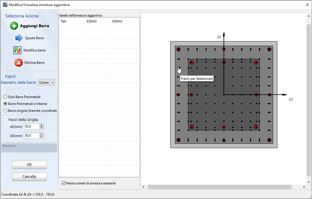 L'aggiunta di singole barre longitudinali di armatura alla camicia può essere effettuata anche tramite il corrispondente modulo Armature Aggiuntive, dove è possibile introdurre graficamente un'ulteriore armatura sia nella parte esistente che in quella nuova della sezione, come mostrato nella figura seguente: