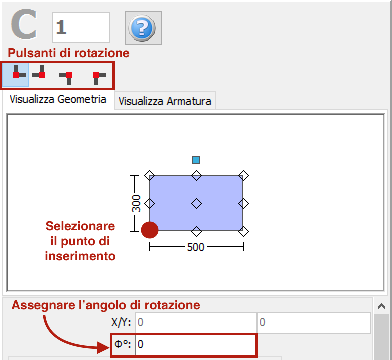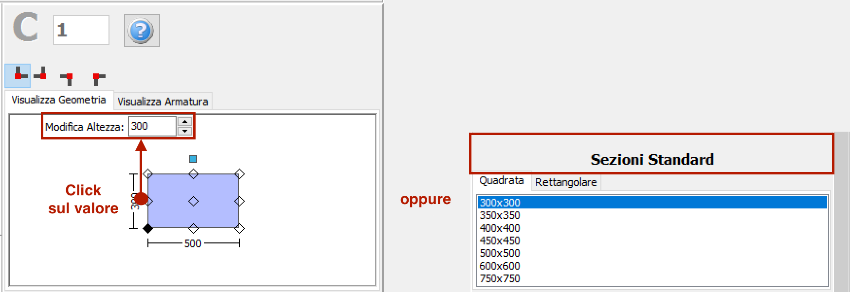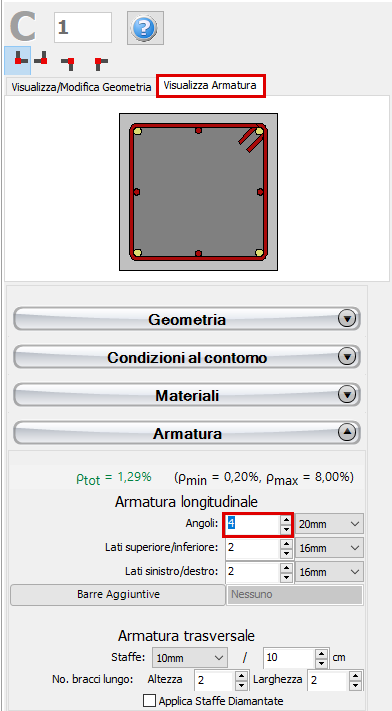 Nella Finestra delle Proprietà gli utenti possono scegliere tra l’opzione Visualizza Armatura, in cui viene mostrata l’armatura della sezione (longitudinale e trasversale), e l’opzione Visualizza/Modifica Geometria, in cui possono essere visualizzate e modificate le dimensioni della sezione.