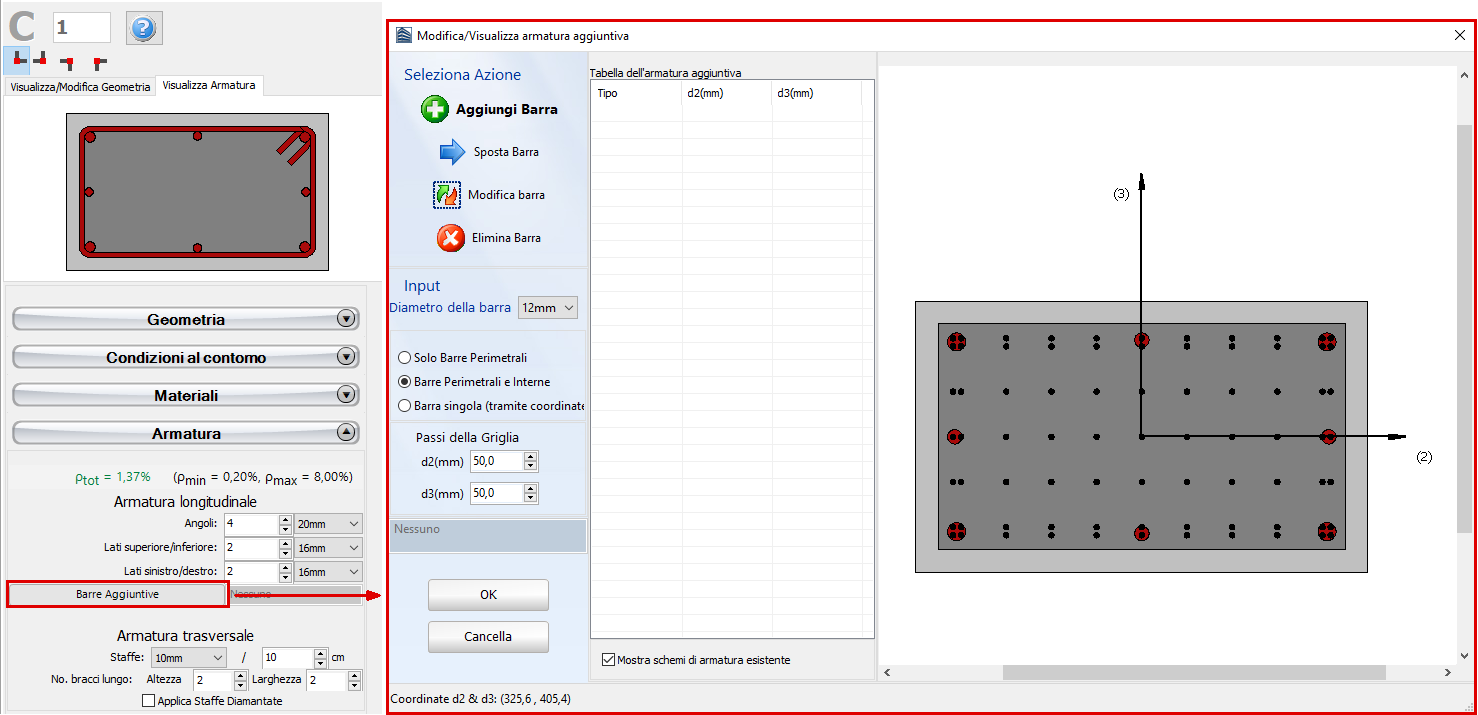 Inoltre, è possibile definire le armature longitudinali e trasversali modificando gli schemi d’armatura rilevanti. È inoltre possibile inserire singole barre d’armatura tramite il corrispondente pulsante Barre Aggiuntive; nella finestra successiva Modifica/Visualizza armatura aggiuntiva è possibile introdurre le barre graficamente, come mostrato nella seguente figura: