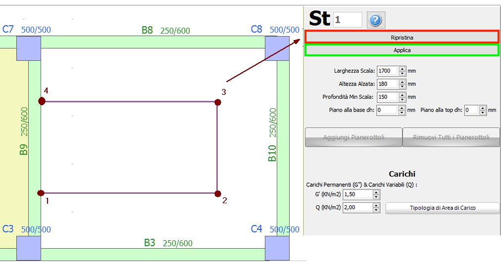 Le rampe possono essere facilmente definite specificando la loro linea di mezzeria. Cliccare il pulsante Applica nella finestra delle proprietà per completare il suo inserimento oppure il pulsante Reset per ridisegnare una nuova rampa.