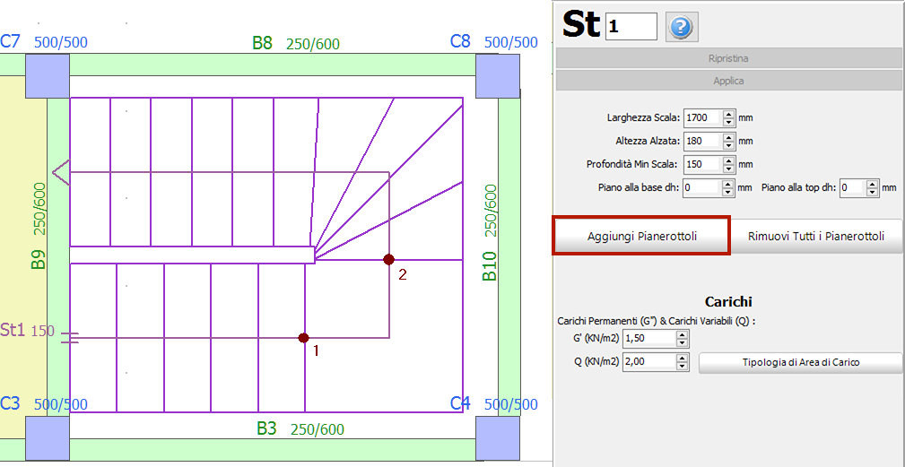 Una volta inserita l’elemento rampa nel progetto, attraverso il pulsante "Aggiungi pianerottoli" è possibile definire i punti di “sbarco”. A tal proposito è necessario specificare graficamente le due estremità del pianerottolo sulla linea centrale. I pianerottoli così definiti possono essere rimossi tramite il pulsante "Rimuovi tutti i pianerottoli".