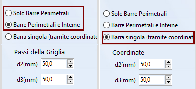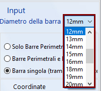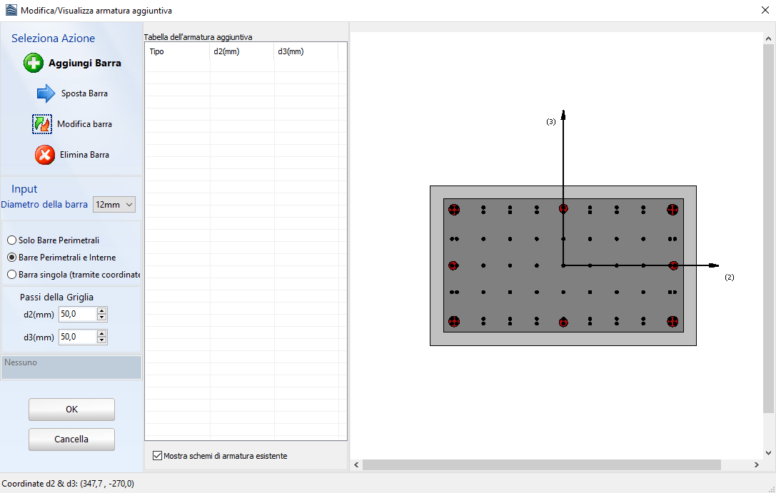 - definire le proprietà della griglia specificando se la griglia deve apparire per tutta la sezione o solo sul perimetro, così come il suo passo; in alternativa, le coordinate dell'armature possono essere inserite direttamente se si seleziona l''opzione Barra singola.