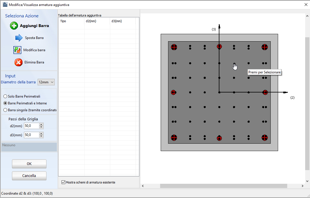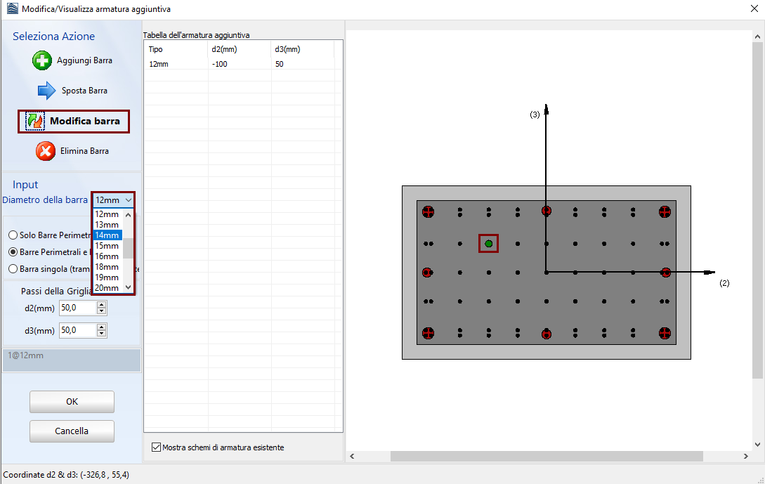 Inoltre, gli utenti possono modificare l'armatura aggiuntiva facendo clic sul pulsante Seleziona/Modifica Barra, quindi selezionare la barra da modificare e cambiare il suo diametro.