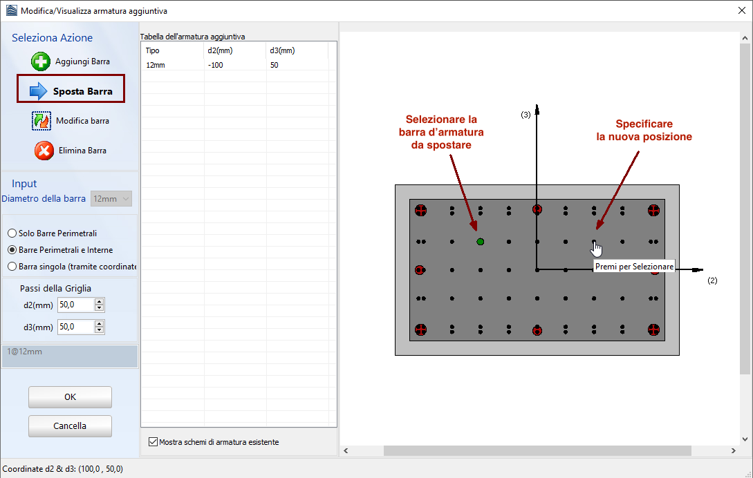 Infine, le barre d'armature possono essere spostate nelle altre coordinate tramite il pulsante Sposta Barra dove l'utente deve selezionare la barra da spostare specificando graficamente la nuova posizione.