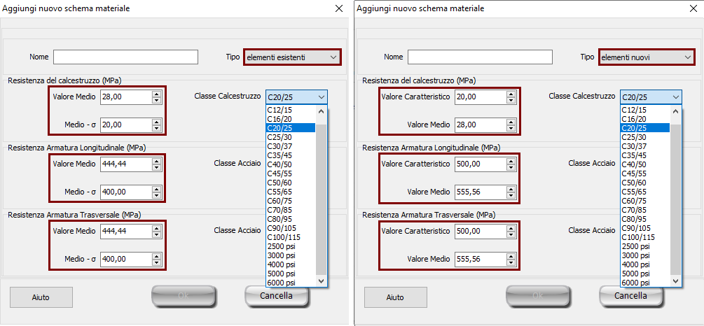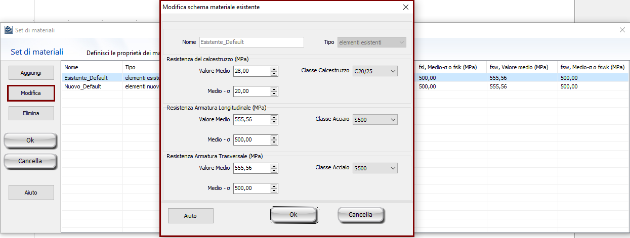Di default, vengono caricati due schemi di materiale, uno per gli elementi esistenti e uno per quelli nuovi. Gli utenti possono modificare i valori dei set di default attraverso il bottone Modifica, ma non possono eliminarli. L'opzione di applicare resistenze dei materiali predefinite, dipende dall'anno di costruzione dell'edificio ed è disponibile quando questo è permesso dalla normativa selezionata. Fino a dieci set di materiali possono essere definiti simultaneamente per la stessa struttura.
