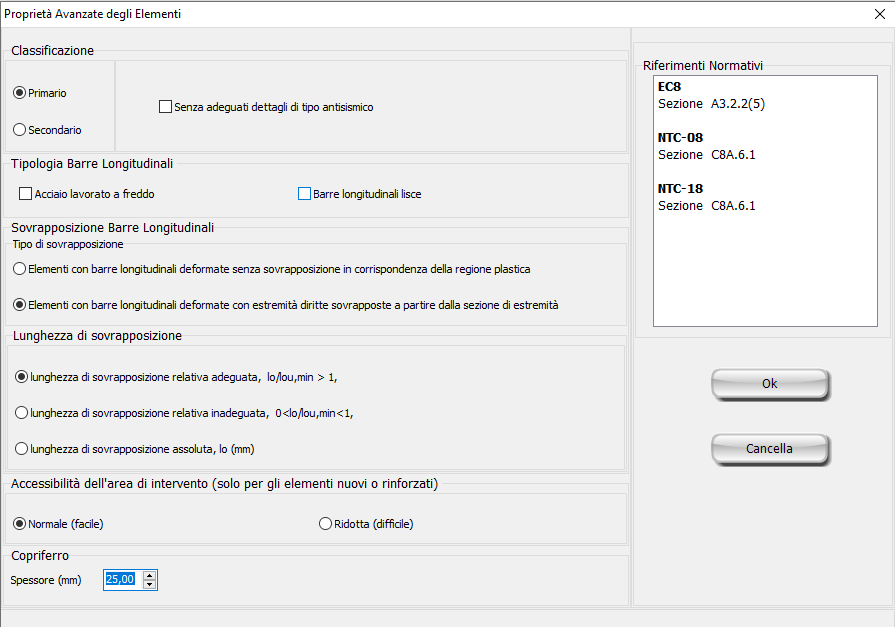 - la lunghezza di sovrapposizione delle barre longitudinali. Si osserva che la lunghezza di sovrapposizione può essere definita in tre modi: (i) gli elementi presentano una lunghezza di sovrapposizione relativa adeguata, rispetto alla lunghezza di sovrapposizione minima per deformazione ultima (opzione di default); (ii) gli elementi presentano una lunghezza di sovrapposizione relativa inadeguata (è necessario definire il rapporto tra la lunghezza di sovrapposizione applicata e quella minima per deformazione ultima); e (iii) gli elementi presentano una lunghezza di sovrapposizione inadeguata (in questo case deve essere assegnata la lunghezza di sovrapposizione assoluta).