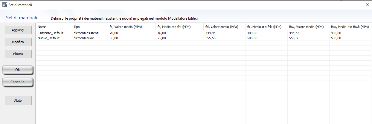, oppure tramite il pulsante Definisci Set Materiali all’interno della finestra delle proprietà degli elementi. Le proprietà dei materiali richiesti dipendono dal tipo di elemento, cioè se esistente o nuovo. Per i materiali esistenti sono richiesti il valore della resistenza media e il valore della resistenza media meno una deviazione standard, mentre per i nuovi materiali devono essere assegnati il valore della resistenza caratteristica e il valore della resistenza media. Di default, vengono caricati due schemi di materiale, uno per gli elementi esistenti e uno per quelli nuovi. Gli utenti possono modificare i valori dei set di default, ma per soddisfare al meglio le esigenze del loro modello possono anche aggiungere nuovi set di materiali (ad esempio quando nel sistema strutturale sono impiegate diverse resistenze dei materiali).