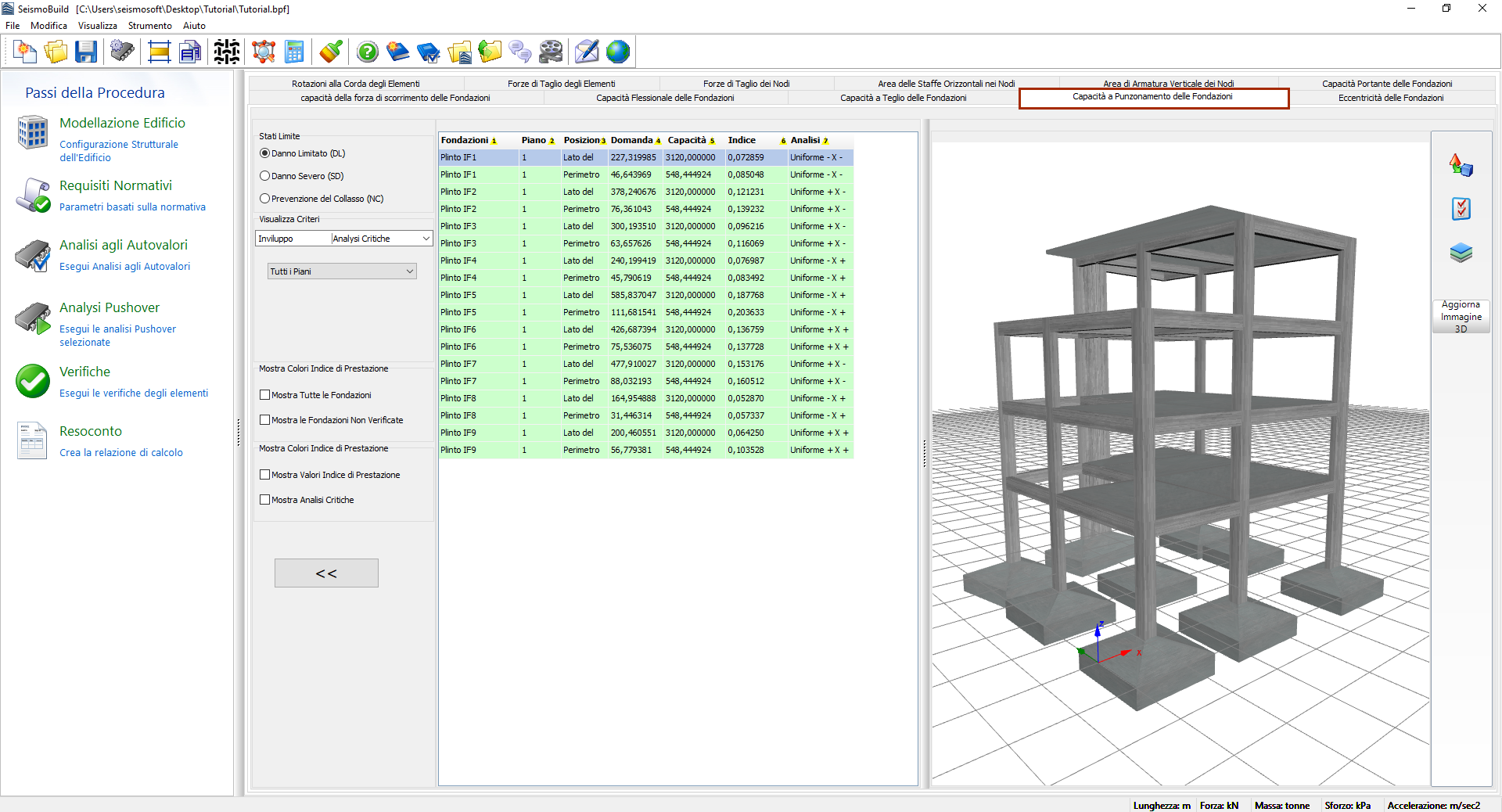 In questo modulo è possibile visualizzare i risultati delle verifiche della capacità a punzonamento per i plinti e per le travi di fondazione, secondo la normativa selezionata. Gli utenti possono selezionare per quale Stato Limite, o Obiettivo Prestazionale, visualizzare i risultati e scegliere i filtri, che includono il tipo di analisi, il piano e l’asse locale. Gli stati limite disponibili sono quelli già selezionati nel modulo Stati Limite in Requisiti Normativi. Inoltre, nel menu a tendina per la selezione dell’analisi oltre alle analisi eseguite c’è un’opzione chiamata Analisi Critica, che è l’inviluppo dei risultati di tutte le analisi. Gli elementi che hanno superato la loro capacità di punzonatura sono contrassegnati in rosso sia nella vista tabellare che nel formato vista 3D, mentre sono disponibili diverse opzioni di visualizzazione. Ad esempio, gli utenti possono scegliere di visualizzare i rapporti prestazionali delle fondazioni o l’analisi critica di ciascun plinto sul grafico 3D, oppure di visualizzare le fondazioni con colori diversi, a seconda del valore del loro rapporto prestazionale per lo stato limite selezionato.