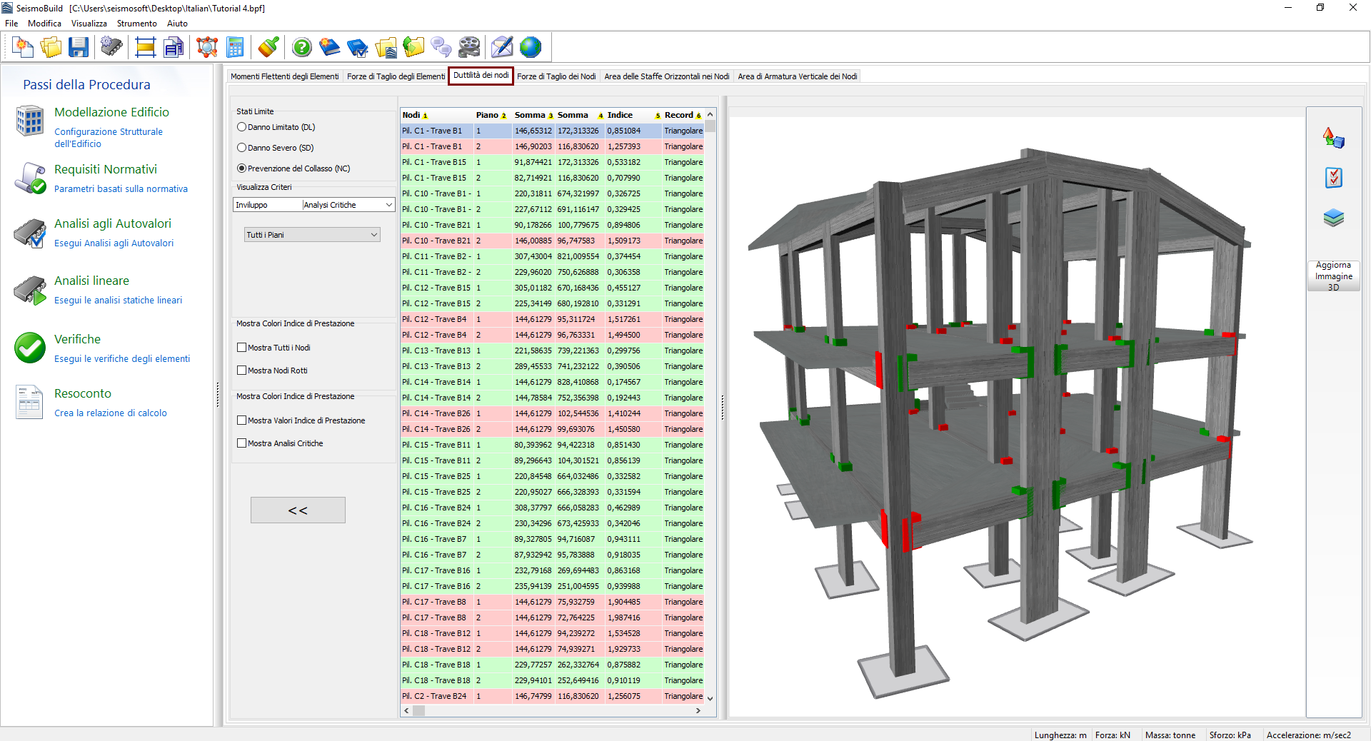 Di seguito vengono presentati i risultati delle verifiche di duttilità per i nodi trave-pilastro. Gli utenti possono selezionare per quale Stato Limite visualizzare i risultati e scegliere i filtri, che includono la determinazione dell'analisi e il piano. Gli stati limite disponibili sono quelli già selezionati nel modulo Stati limite in Requisiti Normativi. Inoltre, nel menu a tendina per la selezione dell'analisi oltre alle analisi eseguite è presente un'opzione denominata Analisi Critica, che è l'inviluppo dei risultati di tutte le analisi. Gli elementi che raggiungono la loro capacità di duttilità nodale sono contrassegnati in rosso sia nella vista tabellare che nel formato vista 3D, mentre sono disponibili diverse opzioni di visualizzazione. Ad esempio, gli utenti possono scegliere di visualizzare i rapporti di prestazione dei nodi o l'analisi critica di ciascun nodo sull’immagine 3D, oppure di visualizzare i nodi con colori diversi, a seconda del valore del loro rapporto di prestazione per lo stato limite selezionato.