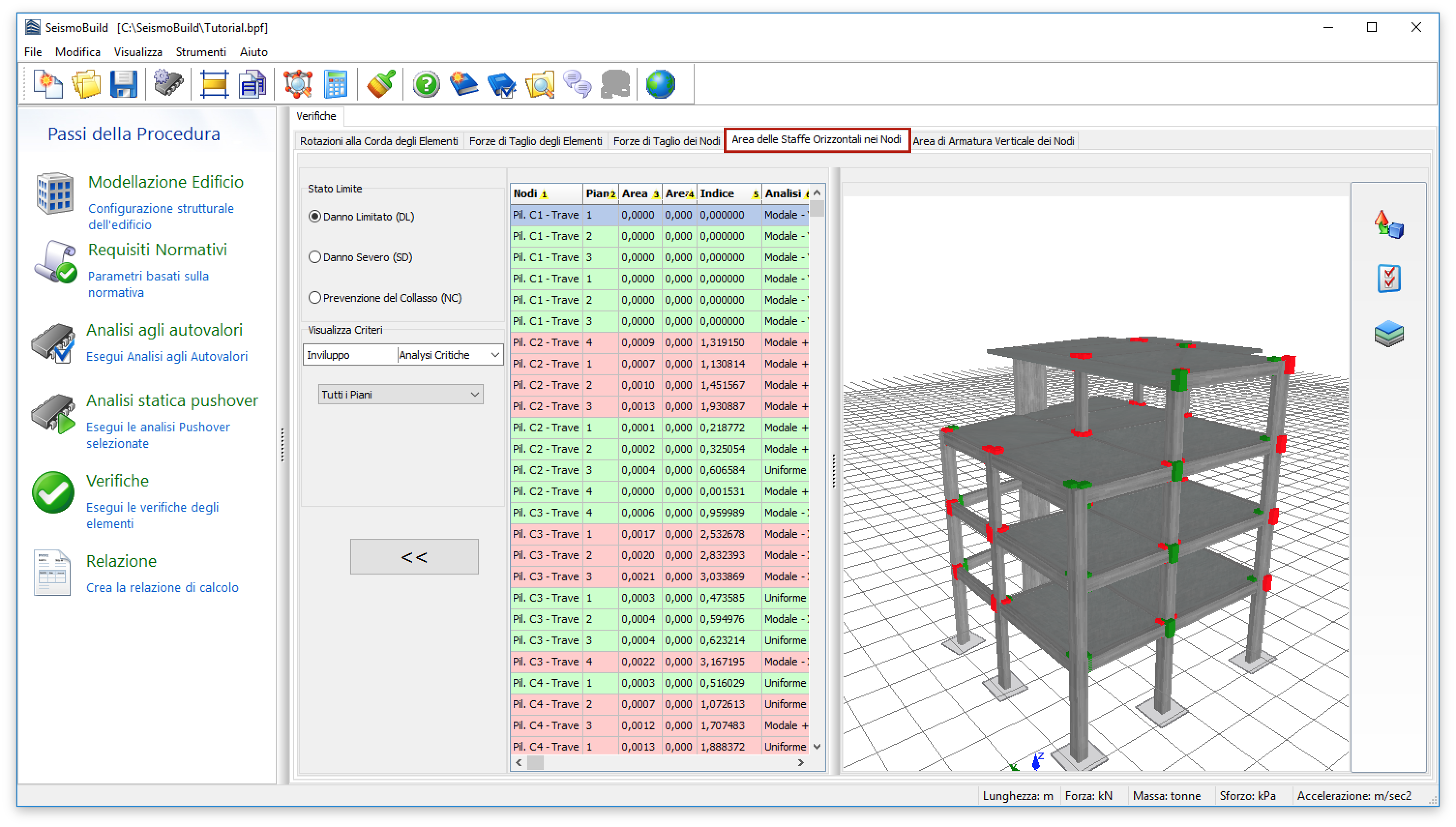 In questa scheda sono rappresentati i risultati delle verifiche dell’area delle staffe orizzontali per i nodi trave-pilastro (questa verifica si applica solamente all’Eurocodice 8). Gli utenti possono selezionare per quale Stato Limite visualizzare i risultati; possono inoltre applicare dei filtri di visualizzazione, come l’analisi e il piano. Gli stati limite disponibili sono quelli che sono stati precedentemente selezionati nella sezione Stati Limite del modulo Requisiti Normativi. Inoltre, nel menu a discesa per la selezione dell’analisi, in aggiunta alle analisi eseguite, è disponibile anche un’opzione chiamata Analisi Critica, che corrisponde all’inviluppo dei risultati di tutte le analisi. Gli elementi (o meglio, i nodi) che presentano un’area delle staffe inferiore a quella definita dalla normativa sono evidenziati in rosso, sia nelle tabelle che nella vista 3D, sono disponibili anche ulteriori opzioni di opzioni di visualizzazione. Per esempio l'utente può selezionare di visualizzare i rapporti di prestazione degli elementi o l'analisi critica nell'immagine 3D per ciascun elemento, o visualizzare gli elementi con differenti colori, in base al valore del rapporto di prestazione per lo stato limite selezionato..