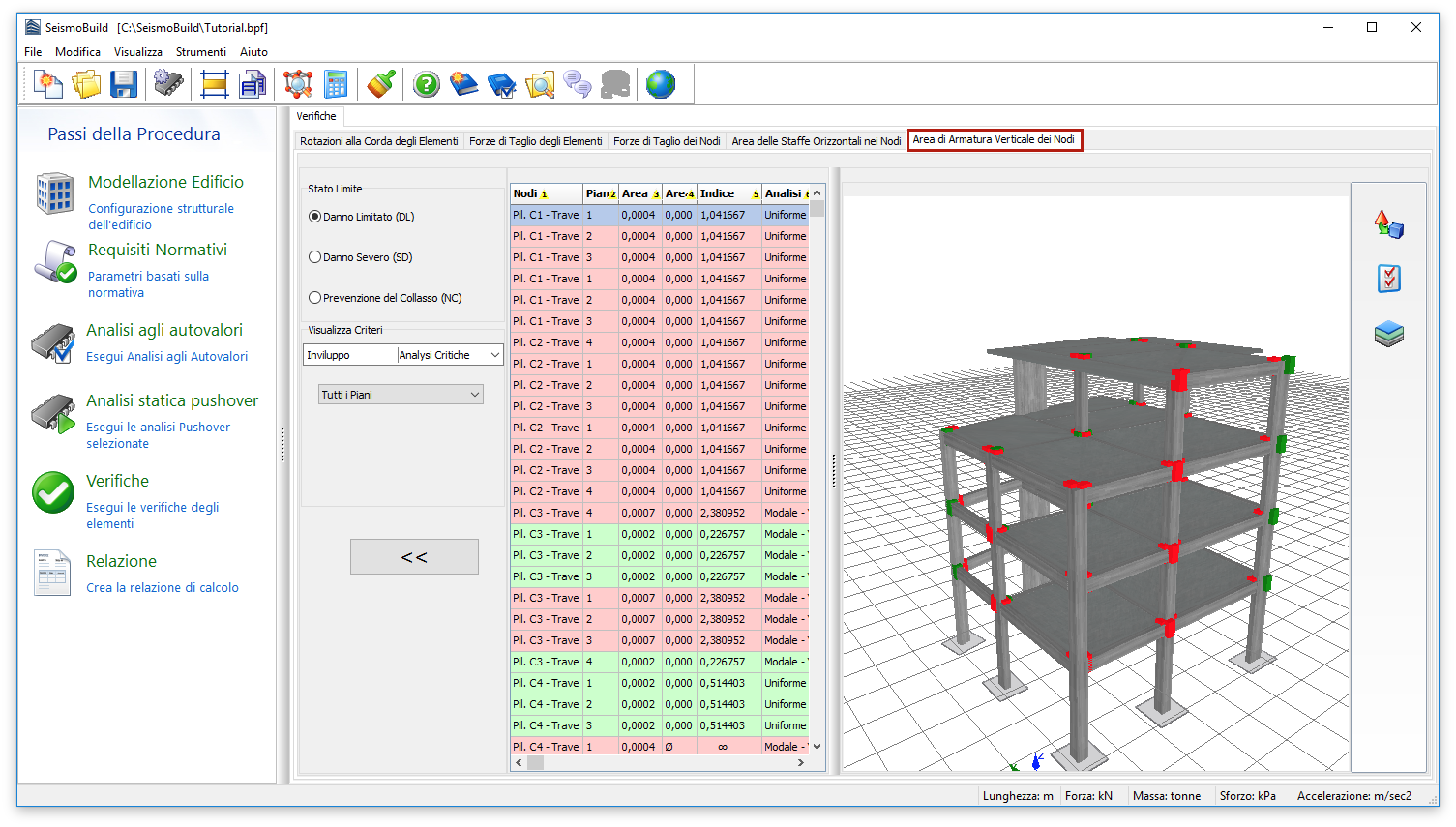 In questa scheda sono rappresentati i risultati delle verifiche dell’area di armatura verticale per i nodi trave-pilastro (questa verifica si applica solamente all’Eurocodice 8). Gli utenti possono selezionare per quale Stato Limite visualizzare i risultati; possono inoltre applicare dei filtri di visualizzazione, come l’analisi e il piano. Gli stati limite disponibili sono quelli che sono stati precedentemente selezionati nella sezione Stati Limite del modulo Requisiti Normativi. Inoltre, nel menu a discesa per la selezione dell’analisi, in aggiunta alle analisi eseguite, è disponibile anche un’opzione chiamata Analisi Critica, che corrisponde all’inviluppo dei risultati di tutte le analisi. Gli elementi (o meglio, i nodi) che presentano un’area di armatura verticale inferiore a quella definita dalla normativa sono evidenziati in rosso, sia nelle tabelle che nella vista 3D, sono disponibili anche ulteriori opzioni di opzioni di visualizzazione. Per esempio l'utente può selezionare di visualizzare i rapporti di prestazione degli elementi o l'analisi critica nell'immagine 3D per ciascun elemento, o visualizzare gli elementi con differenti colori, in base al valore del rapporto di prestazione per lo stato limite selezionato.