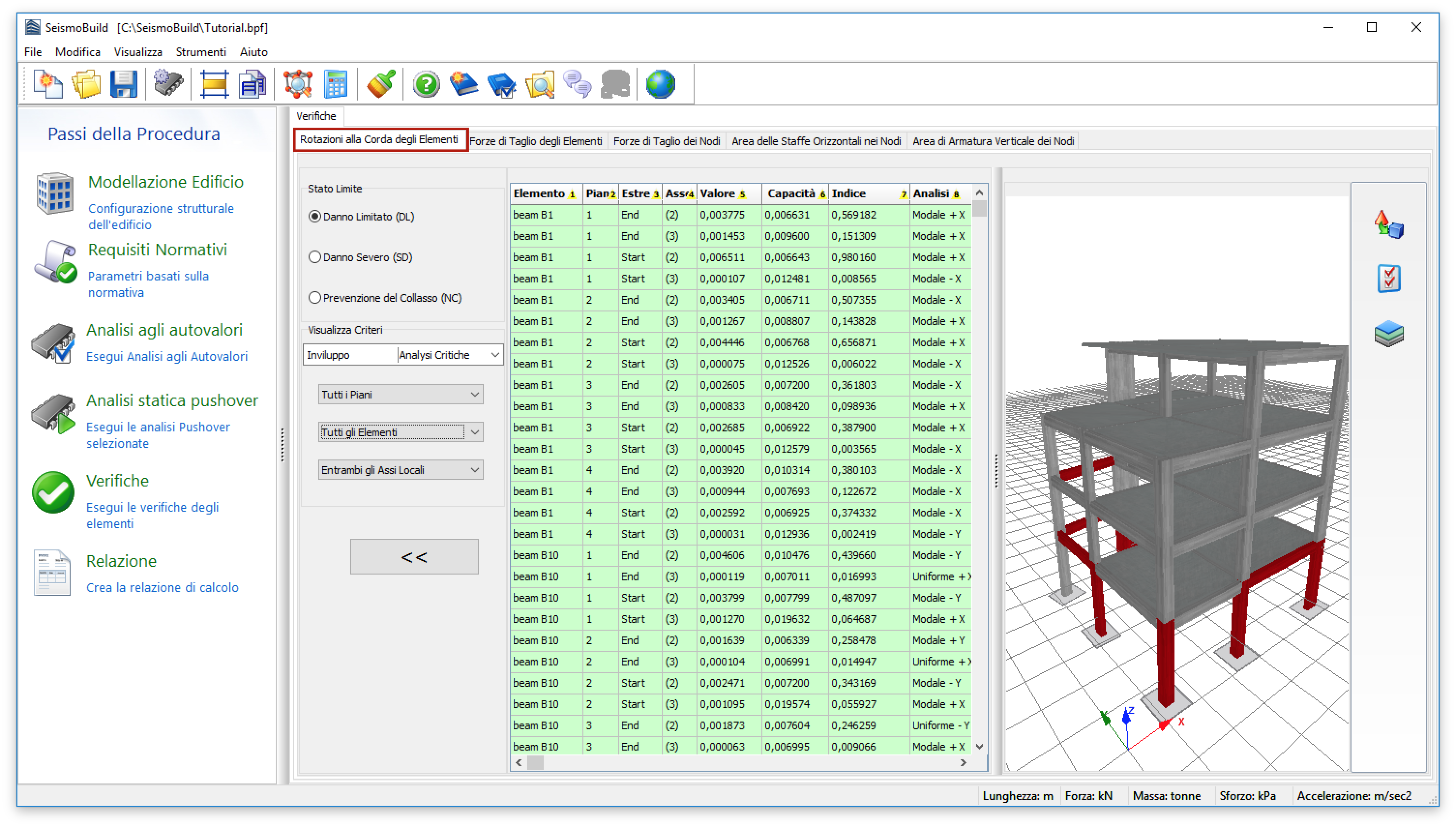 In questa scheda sono rappresentati i risultati delle verifiche di capacità deformativa per travi, pilastri e pareti, in accordo con la normativa selezionata. Gli utenti possono selezionare per quale Stato Limite, od Obiettivo Prestazionale, visualizzare i risultati; possono inoltre applicare dei filtri di visualizzazione, come l’analisi, il piano, la tipologia di elementi e l’asse locale. Gli stati limite disponibili sono quelli che sono stati precedentemente selezionati nella sezione Stati Limite del modulo Requisiti Normativi. Inoltre, nel menu a discesa per la selezione dell’analisi, in aggiunta alle analisi eseguite, è disponibile anche un’opzione chiamata Analisi Critica, che corrisponde all’inviluppo dei risultati di tutte le analisi. Gli elementi che hanno raggiunto la loro capacità di deformazione sono evidenziati in rosso, sia nelle tabelle che nella vista 3D, sono disponibili anche ulteriori opzioni di opzioni di visualizzazione. Per esempio l'utente può selezionare di visualizzare i rapporti di prestazione degli elementi o l'analisi critica nell'immagine 3D per ciascun elemento, o visualizzare gli elementi con differenti colori, in base al valore del rapporto di prestazione per lo stato limite selezionato.