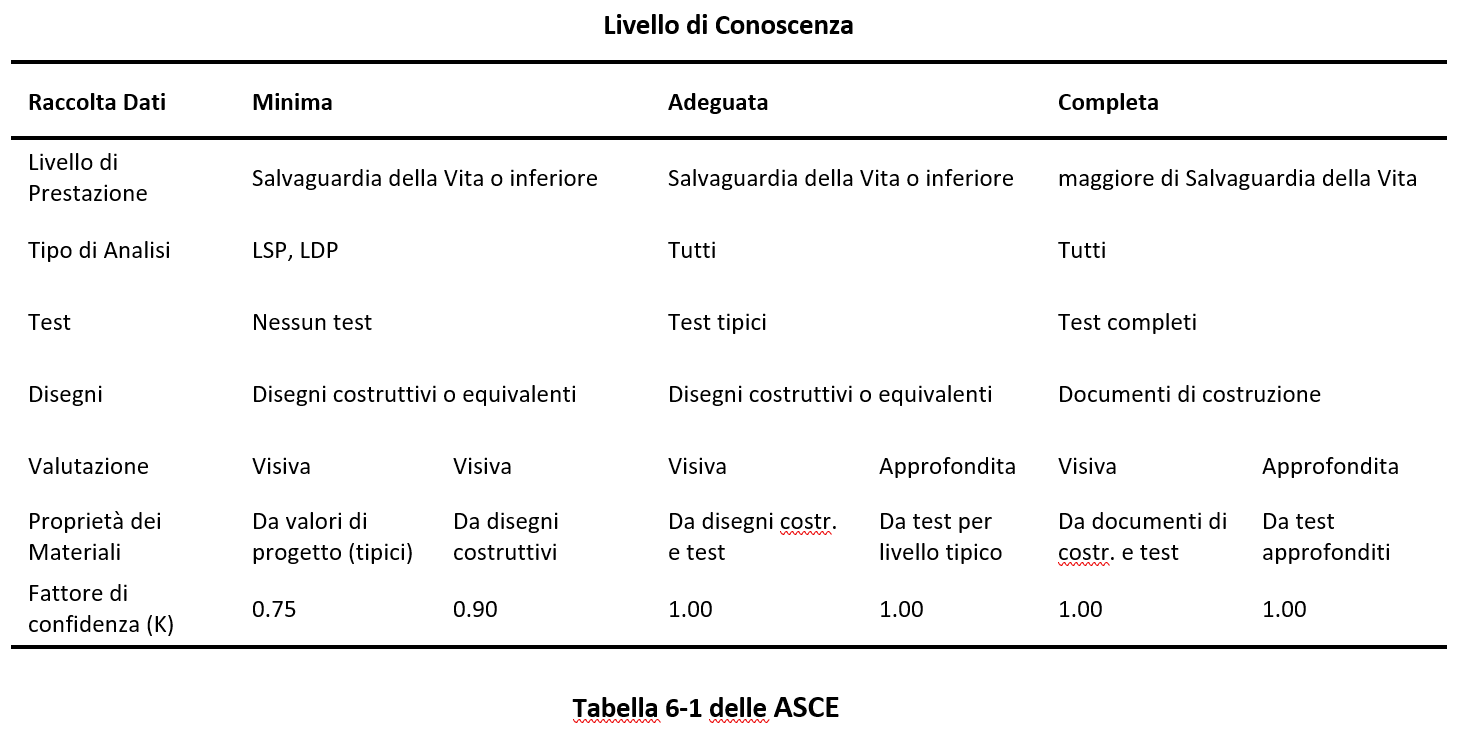 Nella tabella seguente delle ASCE 41-23 vengono forniti un riassunto e le raccomandazioni sui fattori di confidenza e i conseguenti metodi di analisi ammessi per ciascun livello di conoscenza.