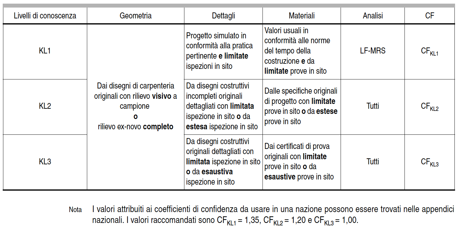Nell’immagine seguente (tabella estratta dalla EN1998-3) vengono forniti un riassunto e le raccomandazioni sui coefficienti di confidenza e i conseguenti metodi di analisi ammessi per ciascun livello di conoscenza.