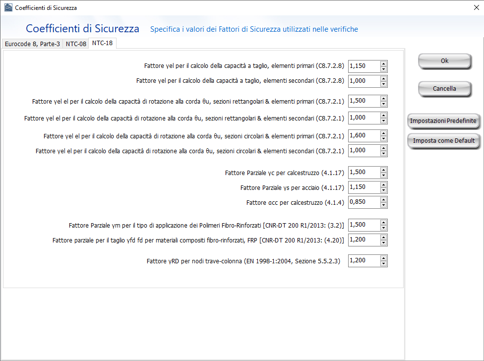 I valori raccomandati dei fattori parziali e di sicurezza, come definito nelle NTC-18, sono introdotti nel modulo Fattori di Sicurezza.Gli utenti possono cambiare e modificare i valori di default.