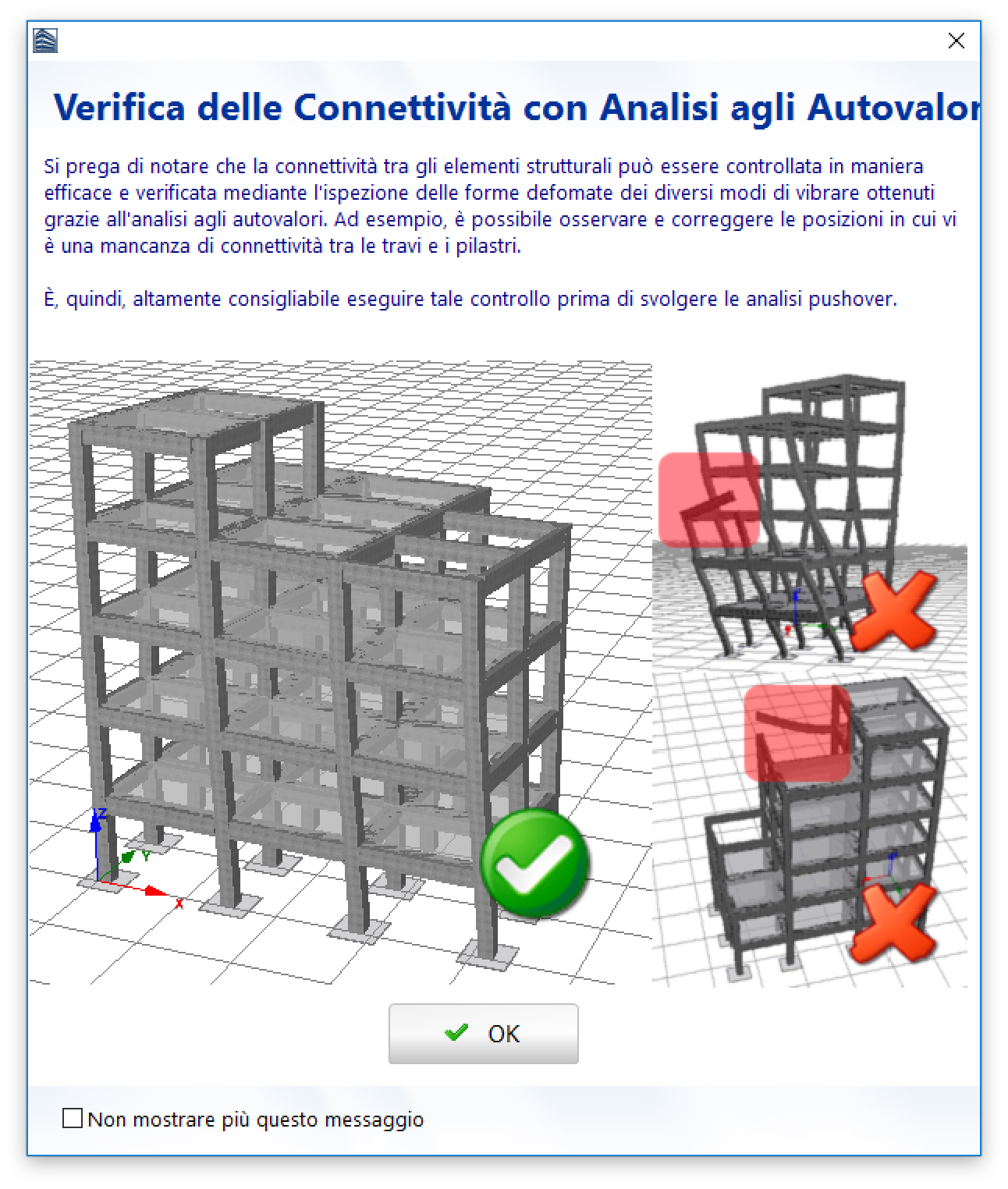 Una volta terminata l’analisi, sullo schermo appare un messaggio informativo che suggerisce di controllare le deformate strutturali di ciascun modo di vibrare dell’edificio per verificare possibili problemi di connettività tra le travi e i pilastri.