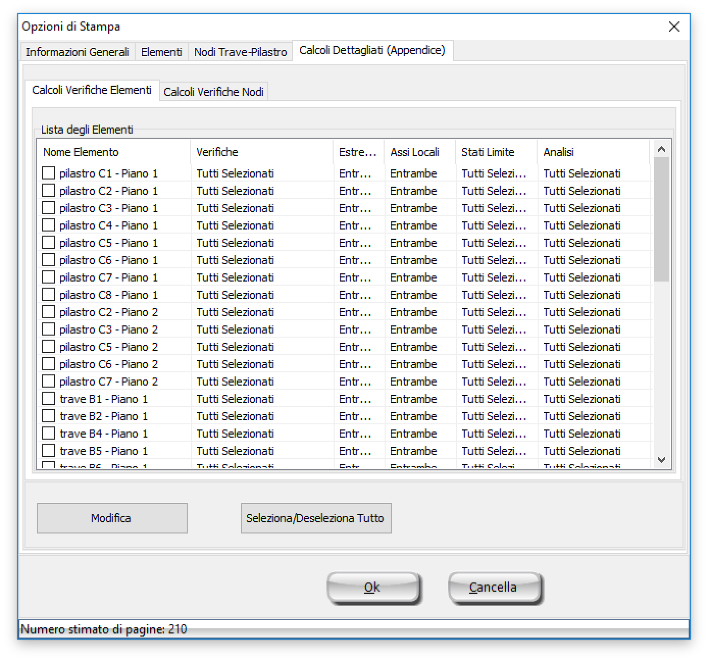 I calcoli dettagliati delle verifiche degli elementi possono essere esportati nella relazione in accordo con le equazioni impiegate, disponibili nella corrispondente appendice della normativa selezionata. Gli utenti possono scegliere le informazioni da esportare per ciascun elemento, ossia per quale tipologia di verifica, estremo, asse di riferimento, stato limite e analisi pushover, selezionando l’elemento e premendo il pulsante Modifica. La selezione di default è di esportare tutti i calcoli delle verifiche degli elementi per gli elementi selezionati.