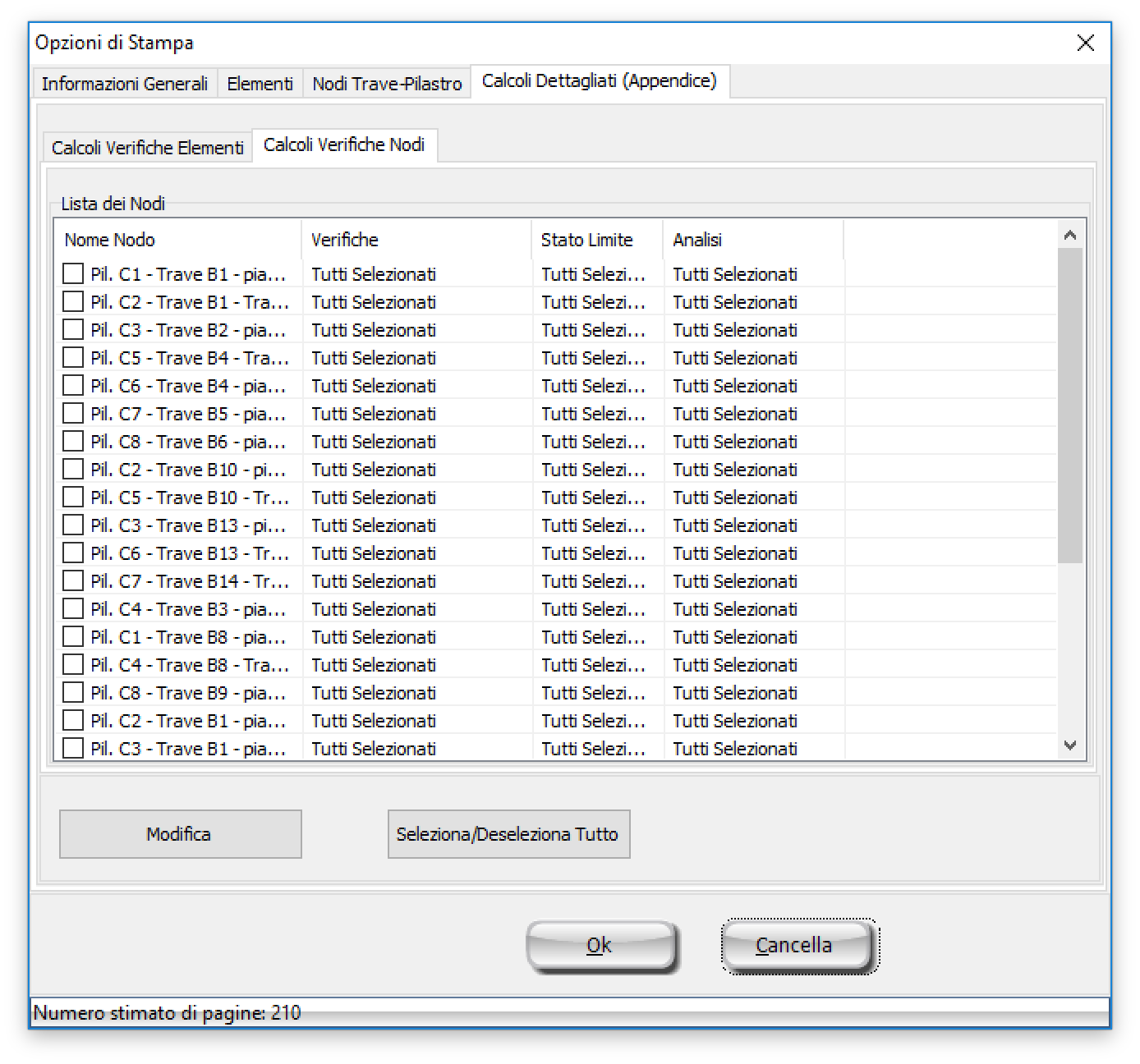 I calcoli dettagliati delle verifiche dei nodi possono essere esportati nella relazione in accordo con le equazioni impiegate, disponibili nella corrispondente appendice della normativa selezionata (Appendix A.1 - EUROCODES, Appendix A.2 – NTC-18 e Appendix A.3 – KANEPE). Gli utenti possono scegliere le informazioni da esportare per ciascun nodo, ossia per quale tipologia di verifica, stato limite e analisi pushover, selezionando il nodo e premendo il pulsante Modifica. La selezione di default è di esportare tutti i calcoli delle verifiche dei nodi per i nodi selezionati.