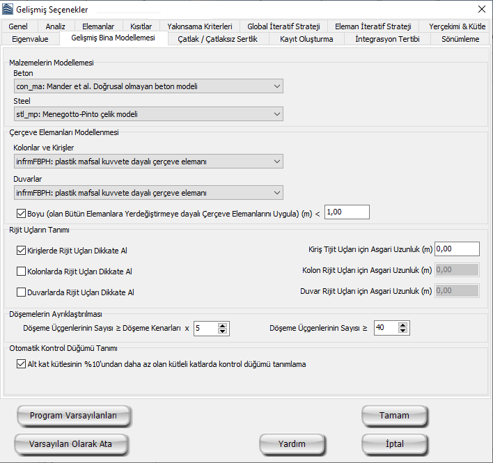 Not: Uygulamaların büyük bir kısmında, Gelişmiş Ayarların varsayılanlarının değiştirilmesine gerek yoktur, zira yapısal modelin gerekliliklerine göre ayarlanabilecek bir Ayar Şeması (Tertibi) seçilebilir. Bu yolla, performans verimliliğ ve sonuçların hassasiyeti arasında optimize edilmiş çözümler sunar.