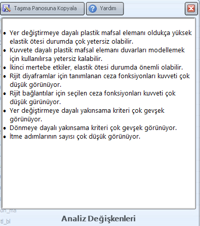 Sıkı yakınsama kriterleri. Yakınsama problemleri yaşanabilir; program tarafından çıkarılan uyarı mesajında seçilmiş olan sıkı yakınsama kriterlerinin olası bir yakınsama problemine sebebiyet verebileceği belirtilir.