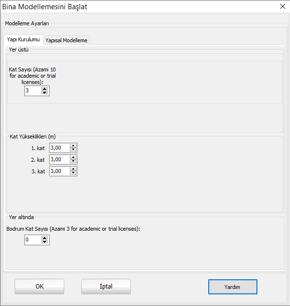 - Yapı Kurulumu: Yapısal düzen sekmesinde, kat sayısı (1-100 kat) ve alakalı kat yükseklikleri tanımlanır (katların her biri farklı yüksekliklere sahip olabilir) veya belirli bir aralıkta olan katlara ortak bir yükseklik uygulama seçilir.Üç adede kadar yeraltı katı (bodrum kat) ve yükseklikleri de tanımlanabilir Bu modüldeki varsayılan değerler bodrum katı haricinde 3 kat ve 3,00m kat yüksekliğidir.