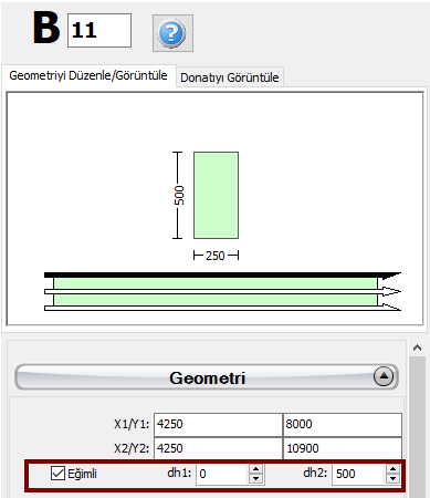 Kullanıcıların, kiriş özellikleri penceresindeki Eğimli seçenek kutusuna onay koymaları ve kirişin iki ucunun kat yüksekliğine olan göreceli yüksekliğini tanımlamalarının ardından bu işlem tamamlanmış olur.