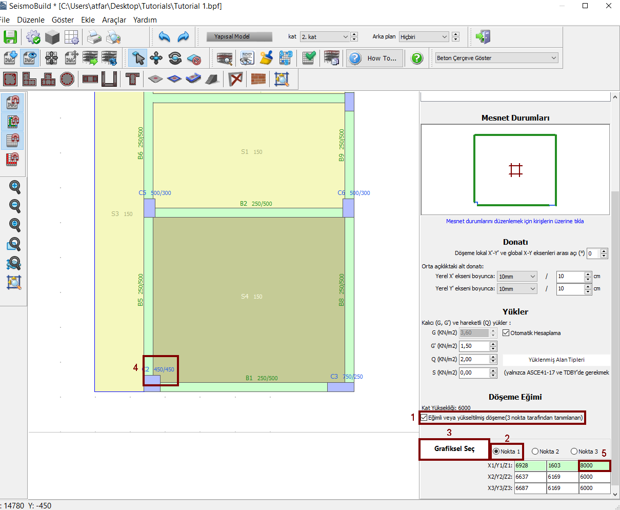 - Eğimli veya yükseltilmiş döşeme onay kutucuğu işaretlenir (döşemenin tanımlanması için üç farklı nokta görsel olarak seçilmelidir);