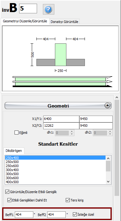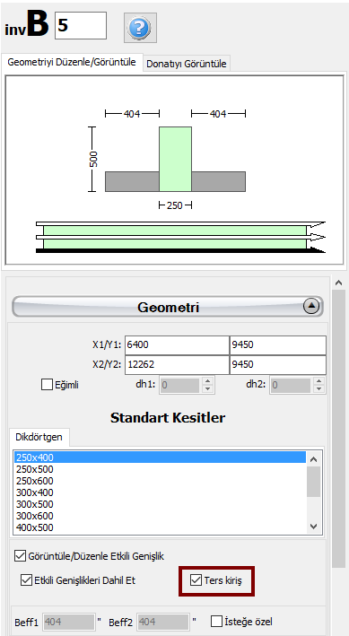 Kirişlerin ve döşemelerin yapısal model içerisine eklenmesinden sonra, kullanıcılar ters kirişleri de tanımlayabilirler. Bu işlemi gerçekleştirmek için, kirişe ait Özellikler Penceresi açılmalı ardından Etkili (Efektif) Genişliği Göster/Değiştir ve Etkili genişliği dahil et onay kutucukları işaretlenmelidir. Yalnızca etkili (efektif) genişliğin dahil edilmesi durumunda, Ters kiriş seçeneği seçilebilir.