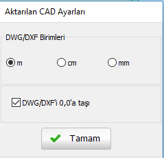 ) tıklanması yoluyla gerçekleştirilir. Çizim eklendikten sonra kullanıcılara çizim birimlerinin tanımlanıp tanımlanmayacağı ve DWG/DXF'nin 0,0 noktasına taşınıp taşınmayacağı sorulur. Onay kutucuğunun işaretlenmesi halinde, orijin 0, 0 noktası yapılır.