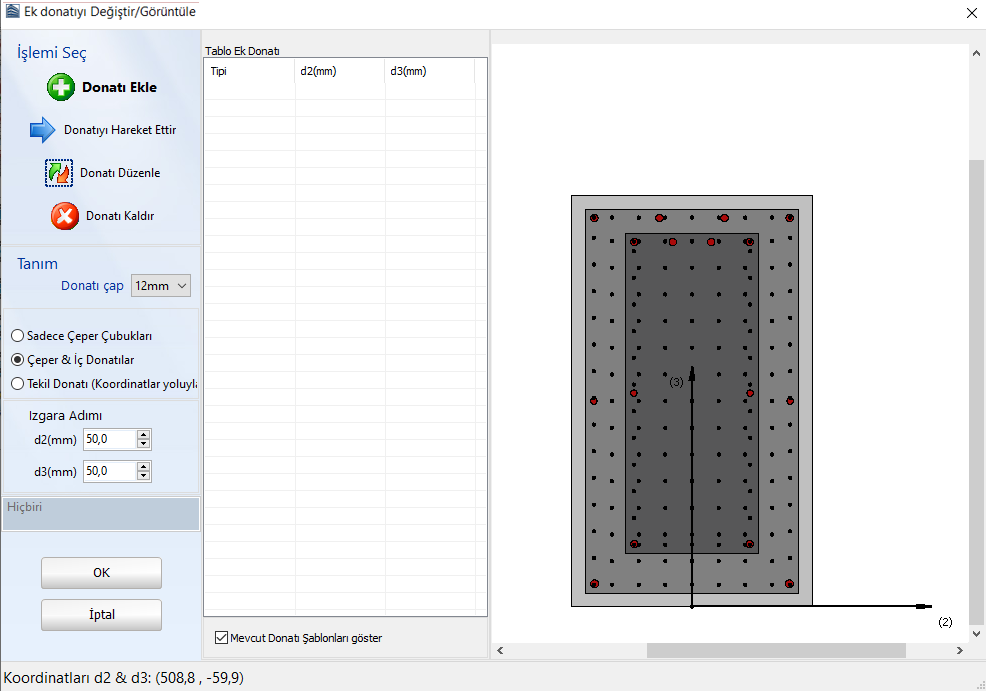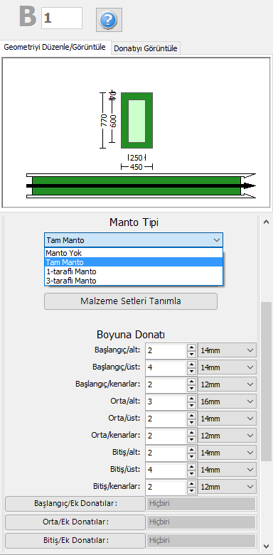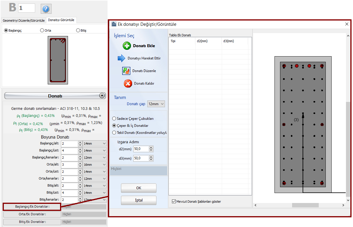 Dahası, boyuna ve enine donatı, ilgili donatı şablonlarını düzenleyerek tanımlanabilir. Farklı donatı şablonları, kirişin iki ucuna ve ortasına tanımlanabilir. Tekil boyuna donatı çubukları ekleme işlemi, ilgili Ek Donatılar modülü aracılığıyla grafiksel olarak da yapılabilir.