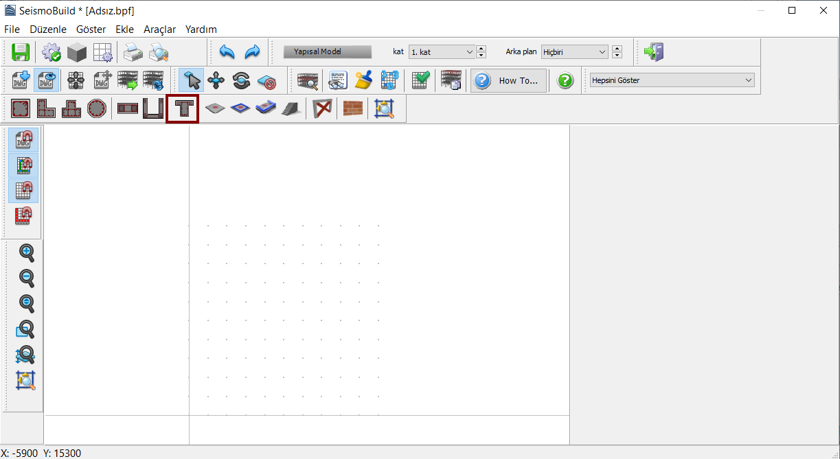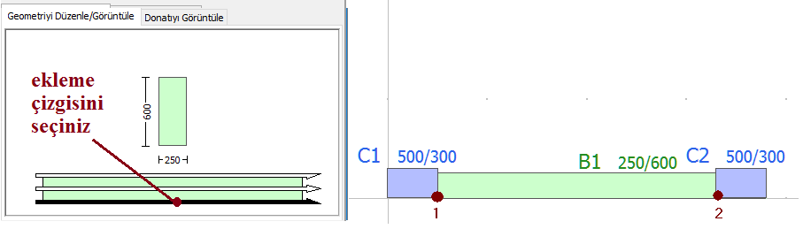 Tüm özelliklerinin tanımlanmasının ardından, kiriş tanımı için, yapının plan görünüşünde kiriş başlangıç ve bitiş düğümlerini gösteren iki nokta belirtilmelidir. Eklenen kirişin çizgi merkezinde veya iki kenarı arasında olabilir; bu, Geometriyi Görüntüle/ Düzenle penceresinde herhangi üç çizgiye tıklanması ile olabilir (siyah çizgi seçili seçenektir).