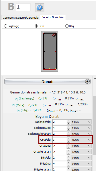Donatı şablonları düzenlenirken, program otomatik olarak Donatı Görüntülenmesi sekmesine geçer, burada kirişin başlangıç, orta ve bitiş kesitlerindeki (boyuna ve yatay) donatı düzeni gösterilir. Kullanıcılar, buradan donatı doğruluklarını kontrol edebilir.