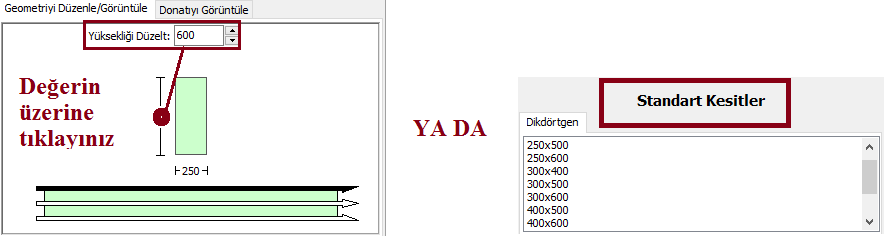 Seçimin başarılı bir şekilde gerçekleştirilmesinin ardından, ekranın sağ kısmında bir Özellikler Penceresi belirir. Beliren Özellikler penceresinden, kullanıcılar ya Geometriyi Görüntüle / Düzenle penceresinden ya da önceden tanımlanmış standart kesitlerden bir kesit seçerek kesit boyutlarını belirleyebilirler.
